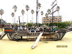 昨年はあいにくの雨で、室内のオワカレーとなりましたが、今年は春らしいお天気で、無事甲子園浜でオワカレーを実施できました。直前の来年度登録者もあり、スカウト・リーダー・ギャング・OB・保護者で総勢33名という久々の大人数で選抜高校野球でにぎわう甲子園球場を横目に見ながら甲子園浜まで歩きました。海浜自然観察センターで磯の動物の生態や実際に触ったりして勉強し、外の春のはまべでのんびりします。そうしているうちにおいしい香りがただよってきて、いよいよオワカレ—の昼食です。持参の白ご飯に、甘口、辛口のカレーをたっぷりかけて、青空の下で「ご飯の歌」をうたいいただきます。やっぱり外ごはんはおいしい! おかわり自由でみんなご飯なしでもおかわりしておなか一杯。デザートも食べ、またまた浜で遊び、ビッグビーバーの卒業式を行いました。カブ隊には3名と復活登録の1名計4名が上進です。これで2025年度行事もおしまい。(K3)