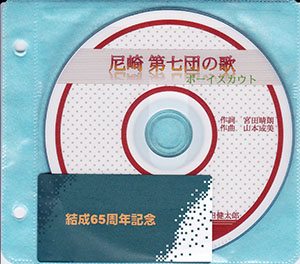 尼崎第7団65周年記念品が先日各隊集会時に配布されました。7団65年の歴史の中で、ずーと誇りに思い歌ってきた宮田晴朗作詞、山本成実作曲の団歌「尼崎第7団の歌」のCDです。加えて、今回は28年度7団構成員を出来るだけ網羅した映像版DVDを製作し、2枚組で記念品としたのです。今年1月に企画し、B-P祭に発表する予定で作業をしたので、写真を集めるのに大変苦労をしました。編曲は昨年団ハイクの時に勇壮なリズムの団歌BGMが完成していました。これに映像とコーラスを加えたのです。そしてこの作業はすべて元芦屋カブスカウトのロバート・デ・ニシダ氏によるものです。感謝を込めて、もう一度この映像を見、曲を聞いてみませんか。7団の未来につながる為に。(K3)