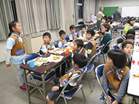 クリスマス集会 ビーバー隊, 行事記録2018 12月 252018 2018年12月23日(日)小田地区会館 昼間のユニセフ募金の後はクリスマス集会。いったん家に帰り、会場の小田地区会館に集まります。まずはスープとアメリカンドッグ、鶏皮唐揚げ、リンゴ、そしてケーキをみんなでいただきました。お腹がふくれると、BP祭での発表用のソング練習。そしていよいよ、キャンディ交換です。隊長スペッシャル2個はなんと新入隊員がゲット。そのほか、クリスマスカチューシャもじゃんけんゲームで分け、楽しい時間があっという間に過ぎたのでした。(K3)