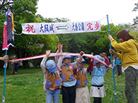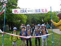 令和元年最初の行事、セブンアワートライアルハーフ、大阪城から大物公園まで歩きます。ビーバー隊主催ですが各隊自由参加で、スカウト・ギャング・リーダー・保護者46名が参加。サポートでゴールに3名が待っています。集合時から雨、大阪城も雨、昼食時も雨で、淀川を渡るあたりからようやくあがってきました。気温が高くなかったので、のども渇くことなく、途中リタイアもなく、みんなしっかり歩き通し、ママチームをトップにほぼ予定通り大物公園に帰着しました。(K3)