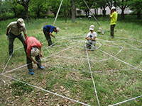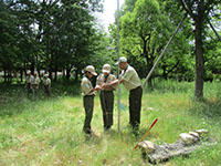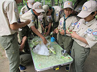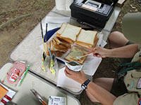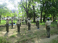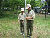 隊集会 ボーイ隊, 行事記録2019 5月 222019 2019年05月19日(日)大物公園 新緑の大物公園で隊集会。26日に初級面接なので、その仕上げと団体験の準備作業です。午前中は、進級科目の残り部分をチェック、そして国旗掲揚法を繰り返し訓練、いつ指名されても大丈夫? 昼食は先週ビーバー隊集会テスト済みの、ジャガリコポテトサンドとハムチーズホットサンド、うまい棒スープでぱぱっと終え、団体験用の迷路、クモの糸、縄ばしごをサンプル実施しました。上班以下全員出席でさわやか集会を終えました。(K3)