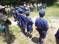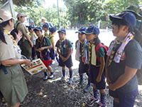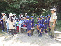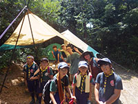 舎営から2週間、8月最初の行事は地区野営への訪問です。お盆期間ということもあり参加スカウトは5名と今年度最少編成で、1組体制で信太山に向かいます。非常に暑い中、信太山に到着すると、他団のカブも続々到着しており、セレモニーで弥生の神の許しを得て、さっそくボーイ隊・ベンチャー隊スカウトのサイトの見学にいきました。7団のスカウトもまだ2日目という事もあり元気そう。お昼を食べて午後からは追跡ハイクで弥生へスリップ。ゴール地点で、令和の扉をくぐって戻ってきたあとは、フルーツポンチをいただきました。追跡ハイクでの入賞はできませんでしたが、なかなか見れないキャンプの様子を見て、ボーイ隊のキャンプが楽しみになったかな?(M34)