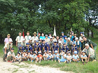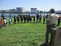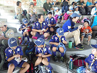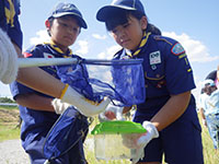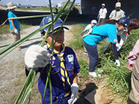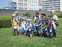 天気が心配されましたが、雲一つない快晴となり清掃日和。帰って熱中症になりそうな天気です。今回はベンチャープロジェクトに協力する形で、神崎川護岸清掃を行います。午前は、混成班になり柳原緑地から歩いてごみを集めますが、ふだんから清掃がされているようで大型のごみはあまりありませんでした。それでも、時間いっぱいまで清掃をして山手幹線の高架下まで進みました。午後からは、環境プロジェクトで「自然と文化の森協会」の方に教えていただき外来種の伐採をしたり、実際のいきものを捕まえてみたり、ここ数年のカン拾いのスカウトデーとは一風変わったプログラムでみんな一生懸命とりくみました。それだけに、帰りはへとへとだったかも。(M34)