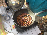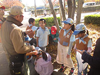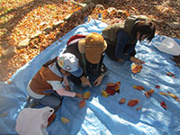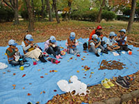今日から12月、なのに大物公園は陽光うららかで紅葉真っ盛り。動くと汗ばむくらいでとても冬とは思えません。そんな中での隊集会、今回も参加者が半数以下の7名、リーダー保護者の方が多いのです。とはいえ、ここ秋を愉しむため、ドングリ集めをしたり、落ち葉アートに挑戦したりしました。前回集会で拾っていたスダジイを煎っておやつにしました。初めての体験で、皮むきは苦労してましたがぱくぱく食べてました。お昼は、冬定番の豚汁、お代り自由でこれも完食。食後小田南公園に移動し、スダジイの実をまた集め、より大きなマテバシイも見つけ、すぐに煎って試食。みんなおなか大丈夫かいなと思うほど取り合いして食べてました。(K3)
