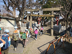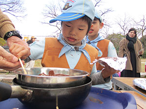 春のようなポカポカ陽気、今日の隊集会は7団地域の神社を9社巡るミニハイク。パパママチームは4名+1で別行動。ビーバーはリーダーとともに全員で出発。最初の吉備彦神社で、お参りの作法を学び以後これを行いました。7社回ったところで時間切れとなり、神様には失礼ながら次回に延期。パパママチームはきっちり時間通りに回り課題もクリア。お昼は大物公園で副長の用意した豚汁で昼食、おいしいおいしいと言いながらなんと5杯おかわりした人がいたそうな。おやつは2月恒例のチョコフォンデュ。口の周りをチョコだらけにしみんなでおいしくいただきました。(K3)