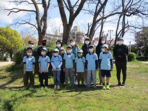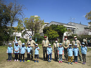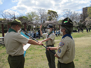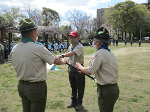 入隊上進式 ビーバー隊, 行事記録2020 4月 062020 2020年04月05日(日)大物公園 コロナウイルスの影響がますます深刻化し先の見通せない中で、何とか2020年度の発進をしたいという思いで、3密を避けて入隊上進式を大物公園で行いました。幸い、桜も満開で好天の中、7団スカウト、リーダー、保護者が集まり、ビーバー隊は7名をカブ隊に送り出し、新たに9名のベテランギャングが「やくそく」をしました。そして新たに3名の副長を得、2020年度の体制を整えました。(K3)
