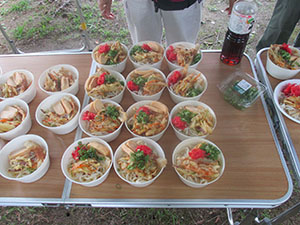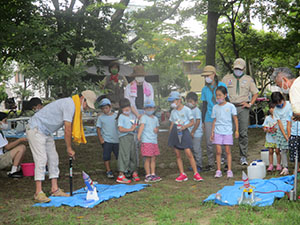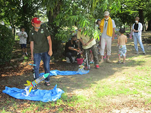 梅雨も明け、短い夏休みに突入。舎営も中止なので連続2回の大物隊集会。今日はPETボトルロケット制作と水鉄砲。持参のPETボトルを加工して一生懸命作り、完成すると発射実験。500mLシングルタイプでしたが、予想以上の飛翔距離でみんな大興奮。その間に副長が調理してくれた揚げたてかき揚げつきのぶっっかけうどんがお昼ごはん。木陰の下でしたづつみを打ちました。午後からはユリ副長の紙芝居、お話で盛り上がり、再度、水鉄砲・ロケット発射でたのしみました。おやつはだいすきなポテト、炭酸飲料つきです。この2L容器は飲み終えるやすぐに大型ロケットに姿を変え、発射されました。コロナに負けない楽しい集会をまた来週も実施だ!(K3)