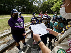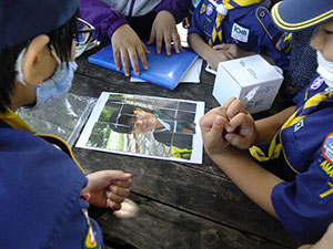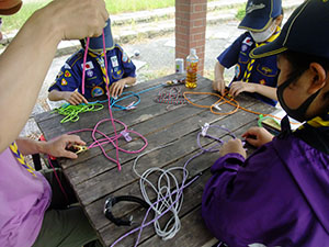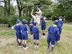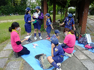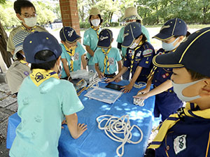 天気に恵まれ隊集会日和。隊長がみんなに持ってきたプレゼントが盗まれた!? ということで、スカウトスキルを使って犯人解明に挑戦しました。この機にロープや計測も復習し、いざ挑戦。スカウトスキルをはじめとして25種類の指令をどんどんこなしてパズルのピースをゲット、犯人の顔を解明していきます。最後には犯人とボスが判明、プレゼントのお菓子もみんなに配ることができました。午後は月の輪集会で、来週のjotiに向けて英会話講座、工作でパラロープブレスレットの作成など盛り沢山の体験をしました。(M34)