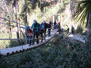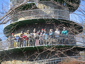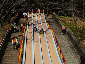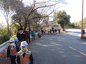 低温、強風が心配されましたが、快晴無風のハイク日和。コロナ流行下、ぎりぎりの判断で対策をしながら実施。コースは五月山登山通り、川西池田から呉服橋を渡り五月山動物園、今回はをウオンバットをスルーし秀望台への最初の登り、運動不足とマスクの呼吸であえぎながらも何とかクリア。五月台への登りを終えると、ゆったりとした山間コース。途中で吊り橋を渡り、いよいよ日の丸展望台へ到着。ここでビバ弁と温かいカップ麺の昼食。三角点も確認し、下山開始。ひょうたん島コースの下りをひざががくがくなりながら歩き、児童館上の通称マキちゃん骨折すべり台で思い切り遊びました。おやつの後池田城へ、入り口で水に張った氷に大興奮し、天守閣へ。尼崎城より小さいものの、なかなかりっぱです。再び活動自粛が予想される中、当分このような屋外活動ができないと思われ、またこのような活動が再開出来ることを祈りつつ、堪能した一日でした。(K3)