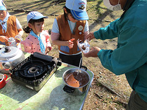 すべての隊活動が自粛、中止、延期となりましたが、通常の学校活動が行われ、野球、サッカー、水泳等の活動は細心の注意をもって持続されています。減少傾向があるとは言え、そこはより注意深くコロナ対策を実施した上で、あえて屋外での集会を実施しました。ステイホームでの課題提供も行いましたが、やはり対面での活動を、リーダーもスカウトも保護者の皆さんも熱望していました。また、来年度登録の時期でもあり、単なる連絡だけで終わる事への危機感も募りました。不用不急の外出規制の中をあえて実行しました。そして、この日曜日、四月なみの気温、快晴。凧揚げは無風状態で失敗でしたが、久々の屋外活動で、元気いっぱい遊びました。そして愛のセントバレンタインチョコフォンデュでコロナ絶滅を誓いました。(K3)