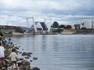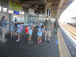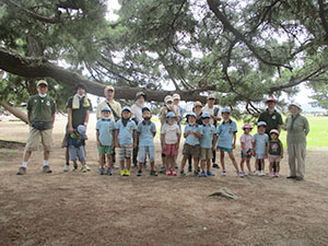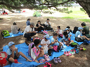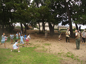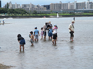 実に半年ぶりの電車利用のハイキング。大物公園ばっかりもそろそろ飽きてきました。そこでちょっと近場の水遊びで香櫨園から御前浜。まさに夏という感じの青空の下、夙川河口でカニ取りや貝集めですが、今年は不漁。カニも小さいのが数匹、ヤドカリも数えるほど、どこへ行ったのでしょう。気温がどんどん上がる中、松の木陰で昼食、午後からは場所を変えて東側に移動。ここもほとんど収穫無し。かろうじて一日一回の開閉橋をみたのがラッキーかな。雷がゴロゴロいいだしたので、松ぼっくり投げもそこそこに御前浜を後にしました。暑くてばてましたが、みんな元気。帰りの電車で今日欠席のH3姉妹副長の中吊り広告を発見、くせになりそうです。てか!(K3)