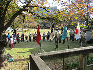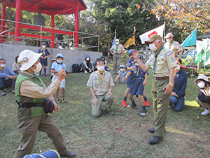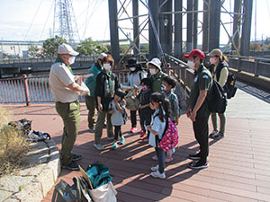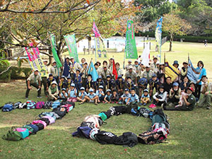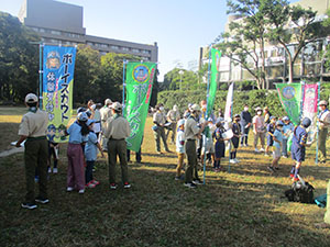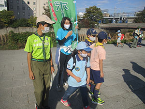 実行委員長の執念で快晴となり、777「7団、なかよく、70周年」テーマの団ハイクが実施されました。参加スカウトリーダー保護者を7つの混成班に分け、活動中や、募集中と書いた大きな幟を持ち、大物公園、城趾公園、戎神社、琴浦橋下田公園、出逢橋の各ポイントで問題をクリアしながら歩きます。尼ロックで温かいラーメンとお弁当を食べ、再び出逢い橋を経て元浜緑地まで歩きました。そして各班対抗の7つ星じゃんけんで最終決戦を行い、最優秀班表彰を行いました。今年度は半分以上がコロナ流行による活動自粛ですが、70周年を機会に今日みたいな元気な若い力が再始動してくれたら、まだまだ希望はありそうな70周年記念団ハイクでした。(K3)
