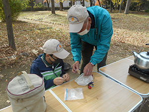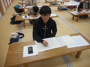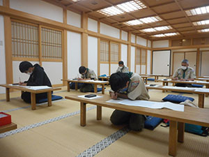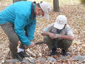 きょうも少人数の集会となりました。キャンプに行けないおかげでこれまで触る機会がなかった刃物の扱い方の訓練をマン・ツー・マンでしっかり行いました。野外で使う折りたたみ式のノコギリは使いにくく、最初の切れ込みがなかなか入りません。リーダーからコツを教えてもらいながら角材を切ります。次はナタの使い方。刃が届く範囲や刃を振る方向に人がいないか確認をしてから使います。ノコギリを使用せずに角材を切断、それを割って焚きつけを作ります。細い焚きつけにささくれを作って燃えやすくし、実際に燃やしてみます。新入スカウトはマッチが怖く、火がつくとすぐはなしていましたが、何度か練習してうまく扱えるようになりました。きょうと同じようにすればマッチ2本でいつでも着火できるはず。次長は麻ひもをほぐした火口にファイヤースターターで着火する上級編をマスター。午後からは上班も合流して寺町の本興寺さんで写経を体験しました。2時間ずっと正座のつらい時間でしたが、筆と墨で一生懸命写します。終わりにはご住職から写経をする意味や仏教が考える世界についてお話をいただきました。今年度受験の上班と次長には良い経験になったと信じます。(sakura)