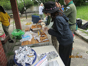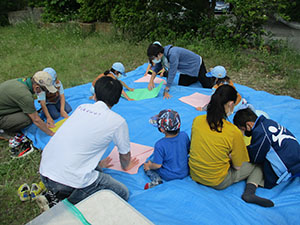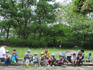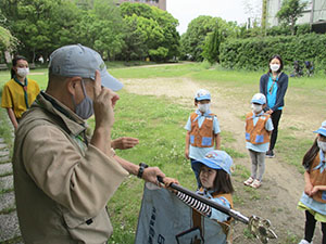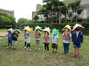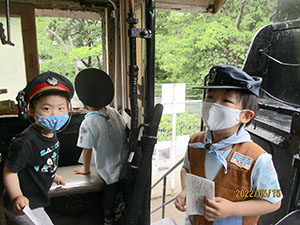 体験で2回参加してくれた元気な女の子が、本日正式入隊してくれました。そして年長の弟くんもギャングとして参加決定。だんだん賑やかになってきました。今回隊集会は、公園内の植物探検、白ツメ草、ハルジオン、とうねずみもち、くろがねもち、ヒメジオンを覚えて、大型折り紙カブト作成。みんなすっぽり頭がはいるカブトで、矢でも鉄砲でも持ってこいといってました。そして、今日は蒸気機関車の開放日、みんな乗車して機関手体験で大喜び。お昼は、初めての焼きそばサンドとスープでお代り続出。食後は紙飛行機作りとボールゲーム。そして解散かと思いきや、午前中の植物5種を覚えているかテスト。ほんといじわるな隊長です。(K3)