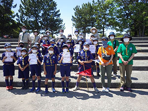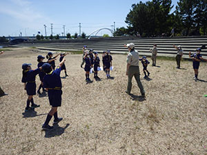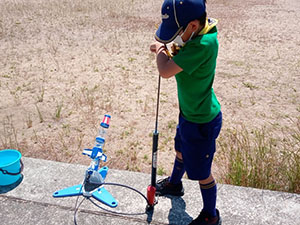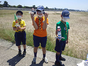 先週作ったペットボトルロケット、カブ隊は20団と合同の競技会を開催することになりました。団のメンツにかけて、負けるわけにはいかない!と並々ならぬ気合で当日を迎えました。雲一つなく、熱中症になりそうな暑さです。集合後、アイスブレイクゲームをはさみ、まずはデザインの品評を指導者でおこないます。そしていよいよ、ペットボトルロケットを発射! それぞれ気合を入れて作ってきたロケットが大空へと飛んでいきます。個人ロケットを2回ずつ飛ばした後、組ロケットの発射。果たして結果は…。個人飛距離は、最高で41.1mを記録した7団スカウト。2位・3位も7団総なめとなりました。肝心な優秀組ですが、20団1組が36mを記録して優勝。優秀組は奇しくも20団に奪われる結果になりました。この雪辱はどこかで果たすことを誓い甲子園浜を後にしました。(M34)