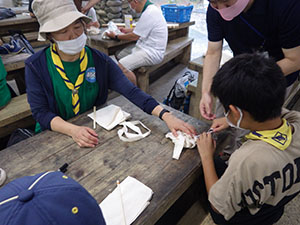 20日は朝ごはんの後、遅れてきたリーダー、デンリーダーも合流して2日目の活動はアマゴつかみ、野外炊爨、藍染め体験、キャンプファイヤーです。残念ながら炊爨の途中から雨が降り出し、キャンプファイヤーはキャンドルファイヤーに変更となってしまいました。雨でも元気なスカウトたちは、キャンドルファイヤーでも大盛り上がりで、スタンツもどちらの組も甲乙つけ難いくらい面白いスタンツでした。前夜に眠れないスカウトが多かったので、2日目の夜はみんな早々に眠っていました。(Y.M)