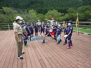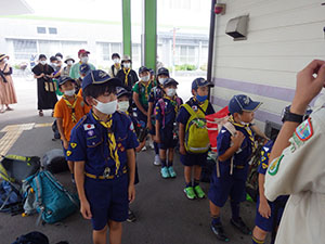宿泊で3日目を迎えるのは3年ぶり。そんな1日の始まりですがあいにく雨でのスタート。朝食&部屋点検後、ゲームをして雨が止むのを少し待っているとほんの少しだけ弱まってきました。そのすきにグリーンテーリングに出発。一生懸命に問題を解いている間に、ヒルが出現、かまれたスカウトがおりました。話には聞いていたものの、咬まれたのを見たのはみんな初めてだったでしょう。終わってからバタバタと昼食、セレモニーをして退出しました。セレモニーでは、最優秀組の1組と、最優秀スカウトのM君、ほかリーダー賞の表彰があり、受賞したスカウトは喜びもひとしお。帰りも同じルートですが、リーダーもスカウトもぐっすり熟睡の様子でした。いろいろありましたが、大きなけがもなく終わった3年ぶりの夏舎営でした。来年も、また行けますようにと今から願わずにはいられません。(M34)