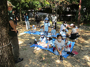 秋の青空どころか夏の空です。久しぶりのハイクは大物から元浜緑地までスカウト5名、ギャング4名、パパママ6名が3組に分れ、シティビンゴカードを完成させながら歩きます。野草観察やお城スケッチをして予定より早く目的地の到着。残りの観察をしてビンゴカードの書き込みをしました。木陰で昼食の後は、元浜緑地名物の遊具に挑戦、お尻を熱くしながらロングスライダーに挑戦しました。また、隊長の顔スケッチコンテストを行い、いろいろな隊長が出そろいました。復路はちょっと楽してセンタープール駅から電車。大物駅帰着後は、恒例アイスのおやつです。(K3)