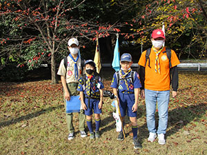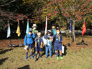 11月下旬とは思えないほどの秋晴れと暖かい日に恵まれ令和4年度の団ハイクが豊中市の服部緑地公園で開催されました。参加者はギャング3名、ビーバースカウト4名、ビーバー指導者2名、保護者5名、カブスカウト8名、カブ指導者8名、ボーイ隊指導者3名、ベンチャースカウト2名、ベンチャー指導者1名、団委員3名の合計39名が集まりました。開会式の後縦割り班を5班形成しそれぞれをきまり班、さだめ班、おきて班、モットー班、スローガン班と名付けオリエンテーリングを開始。19ポストを巡りますがそのうち4ヵ所ではリーダーが課題を出します。もちろんここでの点数も優秀班選出の評価になります。すべて回れた班もあり又、課題での高評価もあり何よりも紅葉した落ち葉を多く集めた班が優秀班になりますが、今回は接戦の末おきて班が最優秀班となりました。豪華景品を分け合って錦秋の緑地公園を後にしました。(ひらパー)