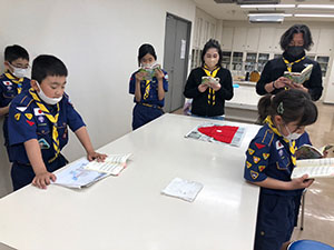上進式と同じ小田北生涯学習プラザで、カブ隊だけの今年度初めての集会です。全員出席だけど、まだ緊張している雰囲気も少し感じられます。今回は、恒例のTシャツ、シーターポン&組旗のデザインなど、1年間のための準備をぞくぞくと行います。最後にソングの練習をする頃には少しずつ元気な声が聞こえてくるようになりました。今年初の優秀組は『いつも元気』だった2組さんになりました。来週は、今年も色々とお世話になる20団との合同集会です。楽しみ!(M34)