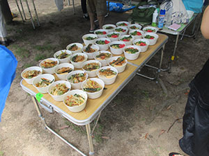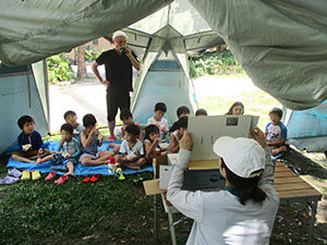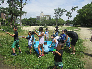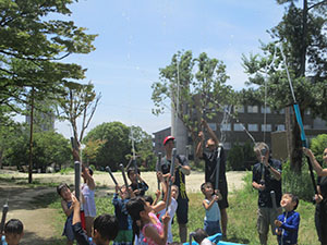 大物公園の森がなくなってから初めての水鉄砲集会。今回は制作無しで今までの在庫でみんなに行き渡りました。梅雨の合間の好天気下で久しぶりに水遊びを堪能しました。プログラムはビーバー対パパ・ママ・リーダーの合戦と恒例水風船投げで午前中いっぱい楽しみました。お昼ご飯は恒例揚げたてかき揚げ付きぶっかけうどんで軽くお腹をいやし、ポテト付き紙芝居3本立ての豪華版。とっても上手な読み聞かせのパパ・ママで揚げたてポテトもおいしかった。午後からも再度水鉄砲合戦。暑い暑い日差しでしたが、気持ちのいい初夏のビーバー活動でした。(K3)