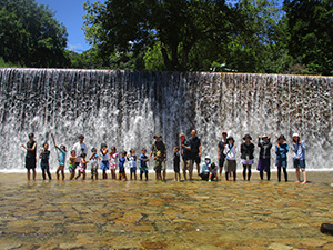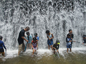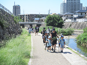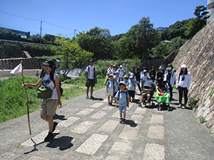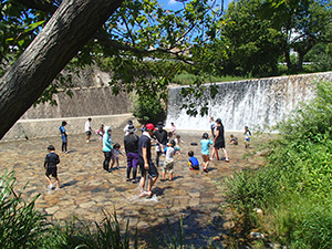 大物での水鉄砲が終わると、住吉川での実戦ハイクがあまななビーバーの定番。ですが、暑い!集合時に30度越えなんて、検温測定してもあまり意味が無いくらい暑い。それでも、水使い放題の実戦ハイクは楽しみです。阪神魚崎駅から住吉川左岸遊歩道を上流2.5kmの新落合橋まで、真っ赤になりながらも水分補給を頻繁にしてしてみんな元気に歩きました。到着するや、すぐに着替えて、水量たっぷりの川で水鉄砲。これで暑さもぶっ飛びました。昼食後はダム上流探検、激しい流れの中で修行体験ごっこをしたり、温泉ごっこをしたりして遊びました。帰りはさすがに疲れましたが、駅でのアイスで復活。元気なあまななビーバーの楽しい一日でした。(K3)