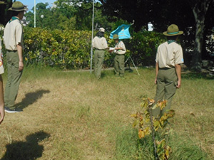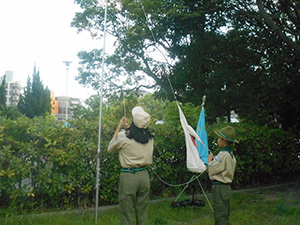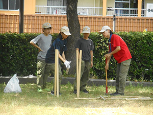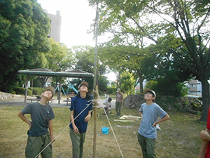 隊集会 ボーイ隊, 行事記録2023 8月 172023 2023年08月06日(日)大物公園 地区合同野営に向けての最終準備集会です。7月の訓練キャンプで実施できなかった野営工作(テーブルと水置き場)の組立方法や班旗立て競争に必要なロープワーク等を確認し、午後から実際に組み立ててみます。班旗立てでは均等なペグうちでないにもかかわらずなぜか15秒以上自立! 偶然でも素晴らしい、、少しずつ班で全員が役割分担し協力し合うようになってきました。この調子で元気に長期野営を乗り切ってほしいものです。 (ヒラマー)
