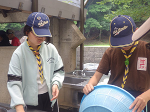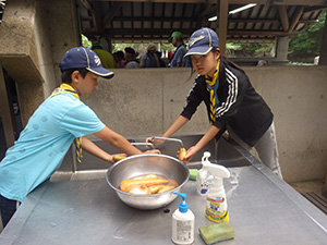 2日目を迎えたるり渓ですが、日陰は涼しく、尼崎とは鳴いているセミの声も違います。それでも日が出てくると暑い暑い。午前はみんなで食べるカレー作り。ご飯は寸胴なべで炊きましたが、団委員長のおかげもあってとてもいい炊きあがり。おいしく食べることができました。空き時間にはまたまたぽてぽてパークで遊び、午後は塗り箸クラフト。大変上手な職人スカウトも誕生しました。たくさんの練習をかさねて、夜はキャンプファイヤー。るり渓の妖精を営火長に呼び、各組一生懸命にスタンツを披露してくれました。(M34)
