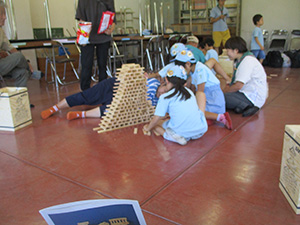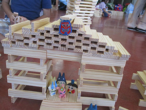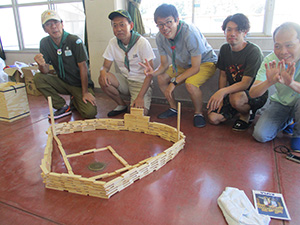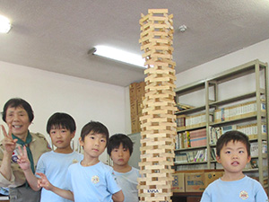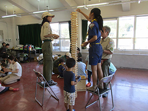 はじめての体験です。幼児教育の分野ではかなり早くから知られていたようですが、「風とんぼ」使用申し込みのおり実物を見せてもらい、舎営プログラムに入れることにしました。積み木は7団BVの得意分野で、ずーと積み木を大事にしていましたが、倉庫解体で一昨年のBV祭りを最後に他団に譲渡しました。今回のような暑い時期の室内プロとしては、なかなかのもので、大人からスカウト、幼児までそのその創造力を確かめながら、5チームが約90分楽しみました。最後に全員でドミノに挑戦しましたが、不安定でこれは失敗。でも楽しいひとときを過ごせ、いい思い出になりました。(K3)