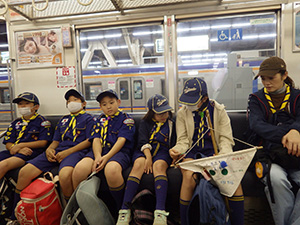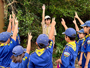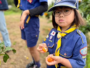 みかん狩り・芋ほり カブ隊, 行事記録2023 11月 142023 2023年11月12日(日)やぶ果樹園 2年ぶりとなる秋の味覚、みかん狩りと芋ほりへ。貝塚市まで電車を乗り継ぎ向かいました。到着後、説明を聞いてみかん狩りを始めますが、たくさん食べるスカウトもいれば、広い斜面で遊ぶのが楽しいスカウトも…。おかげで制服が泥だらけになり、帰りの電車は着席禁止の羽目に。みかん狩りを終えて、芋ほりをする頃にあいにく雨に降られましたが、どちらもしっかり楽しみました。今年は、採集したサツマイモでカブ隊集会で料理をします。(M34)