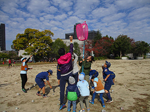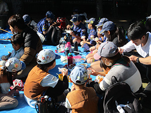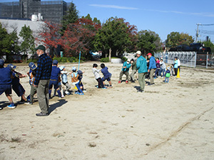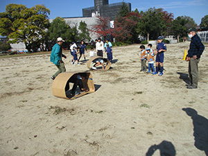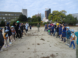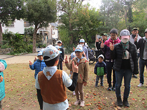 小春日和の大物公園、11月最終日曜はビーバー、カブの合同運動会です。今回は人数も少なかったので、広くなった大物公園で実施しました。チームも男子、女子を赤白に分け対抗戦で行いました。年少さんから5年生、それにデンリーダー、保護者までの幅広い編成で、誕生日順という順番にしたので熱戦に次ぐ熱戦と混乱。ボール送りや徒競走、戦車競走、玉入れ、最後の綱引きまで全10種目を戦い抜き、見事紅組女子チームが優勝しました。お昼は暖かい日差しの下で具たくさんの豚汁、おやつをおいしくいただき、午後からはそれぞれのプログラムを展開しました。ビーバーはどんぐり採取と試食。小田南公園がなくなったので、あらかじめ採取していたマテバシイを煎り、試食しました。そのあと紙飛行機つくりで、よく飛ぶ飛行機をつくり遊びました。天気予報が外れ暖かい集会日和でした。(K3)