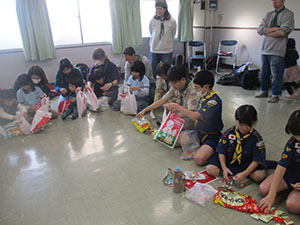 ハンドインハンド、ユニセフ募金の後、場所を移し杭瀬団地会館で久々の団クリスマス会を実施しました。各隊の出し物や楽しいゲームソングでひと時を過ごし、おやつはたい焼きから代わって尼崎名菓S谷のシュークリーム、大ぶりの中にたっぷりのシュー、加えてBV隊のUママのチーズケーキでまさにクリスマス気分いっぱい。キャンディ交換もそれぞれバラエティにとんだもので袋がいっぱい、N田DCの別キャンディや、団キャンディもあり、一足早いサンタさんプレゼントにみんなニコニコ。2023年最後の行事を笑顔で締めくくりました。(K3)