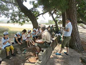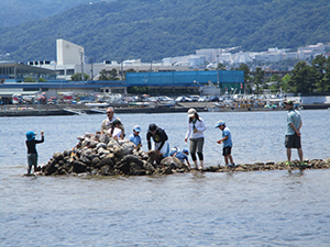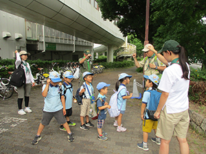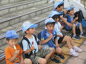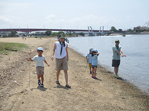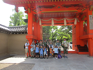予想は外れ、梅雨はどこに行ったのやらと思わせる以上の真夏日和。海風の御前浜は暑いけど気持ちがよかったです。午前中のカニ探しはほとんどいなくて、苦労しましたが、昼食後に渡った芦屋側は結構たくさんのカニやヤドカリがいました。例年ですと、新入隊員ら体験入隊でにぎやかなはずでしたが、今回はスカウトわずかに5名の寂しさ。何とかしなくてはとの思いから、帰路は西宮恵比寿神社参拝コースに変更し、全員で7団繁盛を祈願しました。暑い、次回は水鉄砲。友達きたれ!(K3)