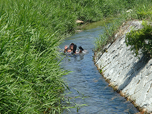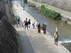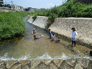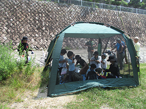 住吉川ハイク ビーバー隊, 行事記録2024 7月 222024 2024年07月21日(日)住吉川 夏休み最初の日曜日が猛暑、恒例の住吉川ハイクも参加人数最小では意気が上がりません。それでもいつものポイントでテントを張り、水鉄砲を十分に楽しみ、今回は見張りもたっぷりいたので特別に水泳を許可、初めての川遊びを堪能しました。住吉川は中流、下流とも多くの家族連れで大賑わい、安全を確保できればこんないい川は都市部には珍しいと思います。ここでの体験をもっと多くの子供たちにさせてやりたい。(K3)