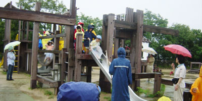 初めてのハイク場所ですが、大物駅で電車に乗った時から雨、この年5月の五月山、6月の大物隊集会と雨に見舞われています。それでも予定通り実行して、午前中の遊具遊びまでは何とかこなしたのですが、昼食時には本降り。見かねたユニバーシアード競技場の職員さんが競技場下の雨天練習場を貸してくれ、そこで昼食、ゲームをしました。この時体験参加していたのが、現Hデンリーダーの長男K君。お父さんが元7団スカウトで体験参加していた女の子(小1)に誘われて初めて参加し、女の子が入隊するなら一緒に入ると決意したものの、本命の女の子は雨に濡れたのが嫌で入隊拒否。あとに残されたK君は断れず一人ビーバー隊入隊。おかげで、お母さんはデンリーダーを2回も経験され、弟までビーバー隊に入ることになったのです。