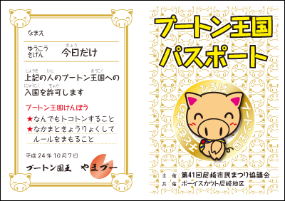 平成24年10月07日に行われる市民まつり、子どもたちの広場のボーイスカウトが担当するコーナーのスタンプカード。例年はボーイスカウトを含む2〜3団体で行っていますが、今年は球場の中で多数の団体と一緒に行います。