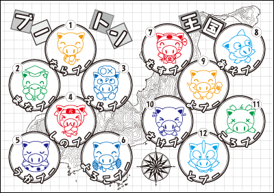 尼崎市民まつり子どもたちの広場でのボーイスカウトのコーナーではゲーム体験コーナー10とモデルサイトと本部の12カ所のスタンプを集めます。各コーナーでは、「あそブー」や「よろこブー」、「しのブー」など12人?匹?のブートンが待ち受けています。
