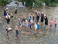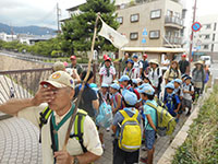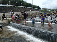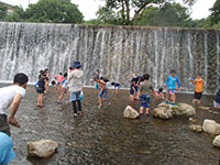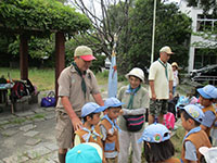 水鉄砲を作り、今日は野外での実戦ハイクです。今年も住吉川下落合橋上流に向かいます。リーダー4名が久々に勢揃いし、加えて団、ベンチャー、ボーイから支援をもらい、総勢43名が参加しました。曇り空で六甲山系は雨雲に隠れ、いつ警報ランプが点灯するか心配でしたが、目的地に到着すると何の心配もなく思い切り水鉄砲合戦を楽しみました。川遊びが出来る数少ない都会の川をたっぷり楽しみ遊び、これぞビーバー活動です。パパママもたくさん参加してくれました。新たに2名がやくそくをして正式入隊、夏期舎営もにぎやかになります。(K3)