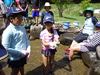 19日…昨日が嘘のような晴れ! アマゴつかみに挑戦し、午後の川登りは水位の上昇で叶わなかったため、池で滝のように流れる水に打たれて滝行?になりました。自分たちで焼いたアマゴはおいしかったかな? 午後は、アスレチックで遊び、ヤマザサで笹船を作るなど、丹波の自然を楽しんだ1日。ファイヤーも丹波王国の王様や、恐竜や、円盤まで?やってきて楽しい時間でした。