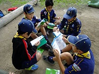 飯盒炊爨に向けて、メニューを決める組集会。そして、隊集会で工作を行い、カブブックの履修にもはげみました。雨という事でしたが小田地区会館は午前中で退出、午後は大物駅の向かいの高架下で続行しました。今年は隊長、副長、スカウトで11名がカブから参加する都市交歓のテーマソングや、中国語のスカウトソングを歌い、楽しみました。『再見』というソングなのですが、歌集にも歌詞がカタカナで載っているので翻訳できません。歌詞の意味を知りたいところです。(M34)