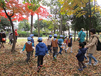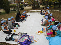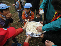 大物公園の紅葉が一番きれいな時の隊集会です。午前中は風もなくお日様の下で、落ち葉拾いと椎の実集め。落ち葉はフィルムに挟んでオブジェとネームプレートにしました。そして椎の実は乾燥して次回隊ハイクのおやつにします。お昼は副長とママたちの準備したカヤクご飯と豚汁を何回もおかわりしてお腹いっぱいになりましたが、ポップコーンのおやつは別腹でお腹いっぱい食べました。「大変だーじゃんけん」と「しっぽ取り」でエネルギーを発散し秋の隊集会は終わりました。(K3)