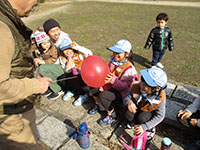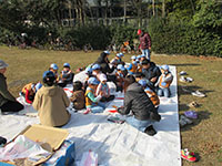 久しぶりに暖かい好天気、しかし。凧揚げにはちょっと残念。東部下水処理場への移動はやめて大物公園と稲川公園での凧揚げです。午前中は今までのクニャクニャ凧はやめてデルタカイトを作りました。それぞれのデザインをみんなで考えて絵を描き上げ組み立てました。たっぷりのカレースープをビバ弁と一緒にいただきお腹いっぱいで稲川公園に移動して凧揚げに挑みました。しかし風が弱くなかなか高く上がらず苦戦してました。大物公園に帰ってからは、新ゲーム「しりとり風船」でどきどきハラハラ、スキー舎営でもする予定です。(K3)