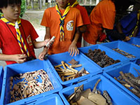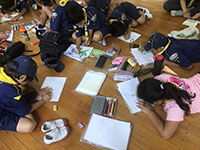 2日目は、同時に宿泊する茨木一団さんとの合同朝礼から始まりました。リバーボートもご一緒に…の予定が、天気が悪く無念の中止…。それを晴らすかのように、スカウトたちはクラフトで個性を発揮しまくり、持って帰るの大変〜という大きさの作品が多数誕生しました。宿題一個、減ったかもね。昼からは、副団委員長とベンチャーに教えてもらってテントの設営にチャレンジ。変わった形だったからちょっと難しかったね。夜も、キャンドルファイヤーになってしまったけれど、スタンツはすごく良かったです。
