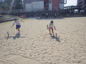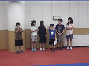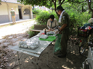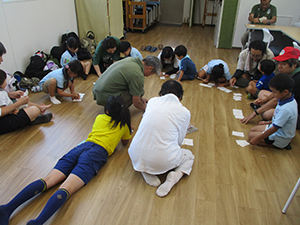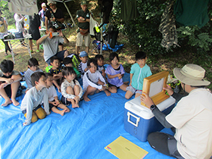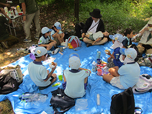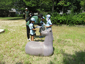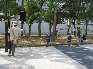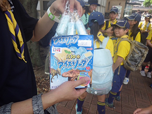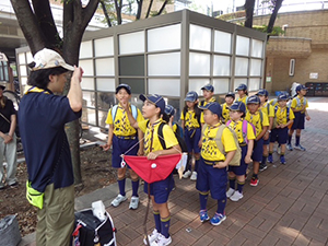 ついに大物公園の改修工事が始まりました。夏休み第一回目の隊集会は、大物川緑地探検ビンゴハイクです。猛暑の中、植物、遊具、看板、コンクリート動物など30個の指定物をさがして歩きます。ゴールは旧尼崎城東大手橋跡、約二時間で二組とも無事ゴール。ここで移動調理班が今日のお昼、コロッケドッグと冷たい飲み物を用意して待ってくれています。涼しい木陰でたっぷり食べて帰路へ。残りのビンゴを完成し、いよいよ今年完成したばかりの三ノ坪会館に移動、冷たいクーラーの中で、基本動作、ソング練習、ゲームを楽しみました。こんな集会場所が欲しい! 切に思った猛暑の中の隊集会でした。(K3)