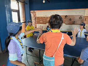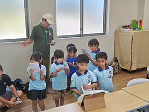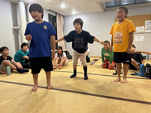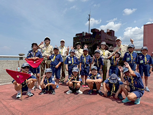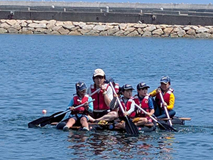 2日目も天気は快晴、暑そうです。朝ごはん、点検もスムーズで、部屋も例年に比べてとても綺麗です。しかスカウトがしっかりしてくれています。午前中は、イカダ作り&乗船。なんと、ふだんのロープ結び(本結び)が役に立ちました。スカウトスキルがあってよかった。暑かったけど、船の上は気持ちよかったですね。少し休んで昼からは館内探検とビーチコーミング。直射日光がすごいですが、日陰を探して一生懸命貝殻を集めます。夜はボンファイヤー。施設のマスコット『くらたん』を呼んで各団のスタンツはもちろん、いろんなゲームで楽しい時間を過ごしました。(M34)