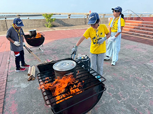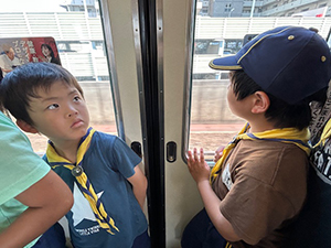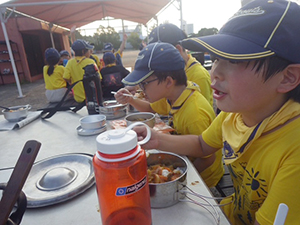 猛暑の続く中、夏舎営当日を迎えました。集合時に、団委員長からアイスの差し入れ。元気が出たらいよいよ出発です。宿泊場所の近くの砂浜と公園でしばらく時間を過ごします。大きな滑り台や噴水があって楽しいところでした。明日のイカダ作りで使うかも…でロープワークも少々。3時ごろに施設に入り、宿泊室『咸臨丸』へ。荷物を置いたらすぐに、夕食のカレー作り! こちらも順調で時間内で美味しいカレーを、夕陽を見ながら食べられました。夜はみんなで楽しくゲームをして過ごし、眠りにつきました。(M34)