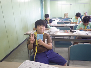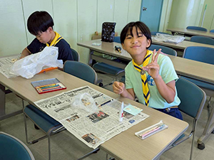 最終日も、いいお天気。プログラムの前に部屋を片付けてしまいますが、リーダーの点検前にすでにキレイな状態。今年はみんな、例年以上によく頑張っています。昨日の貝殻を使った『シェルメモリー』という工作を作りました。それぞれのセンスが光る作品ができて、3日間の思い出にぴったりですね。最後は、3日間とてもよくできていた7団に優秀組をいただくことができました! 笑いあり、ちょっと涙あり?の3日間は無事に幕を閉じたのでした。(M34)