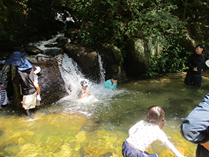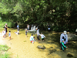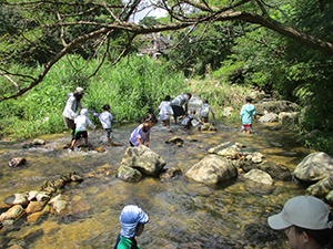 今年は夏季舎営を断念し、代わりにたっぷり夏遊びデイキャンプを実行。人出のことを考えて、あえて盆休み明けの月曜にし、仁川広河原へ電車・バスに乗り継ぎ甲山大師からミニハイク。先発隊と合流し、着替えてすぐに塩バナナをたべ、川の中へ。住吉川と違って森の中の自然の川感たっぷりで、さっそく水泳もどきや、恒例水行を楽しみました。お昼は中身たっぷりのホットサンドとスープ、食後はテントの下で新規入隊パパによる紙芝居3本立て。再度川遊びを楽しんで、帰路バス停までの苦しい登り道を元気いっぱい歩きました。ギャング一人増えてにぎやかになりました。(K3)