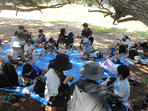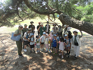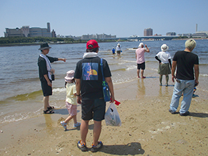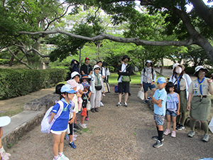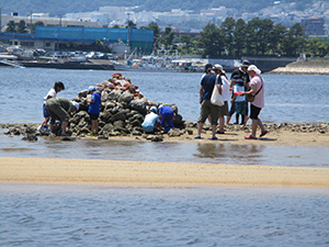 体験シリーズ第3弾御前浜「カニカニ祭り」ハイク。早くも梅雨明けでとにかく暑い! そんな中、体験参加者とその兄弟、保護者の皆さん、そして合同開催1団BV隊5名が加わっての久々の大デゲレーション。香櫨園駅で合流し、夙川沿いの木陰を歩きます。しかし、御前浜につくとかんかん照りの太陽。定位置の松の木陰で準備をし、いよいよ浜辺に。午前中は満ち潮で、カニもほとんど見つかりません。みそ汁付きのお弁当をたべ、ゾンビゲームをし、砂に埋もれた宝探しをしていると、引き潮で長い洲があらわれてきました。ここからは取り放題でカニカニ宴会。みんな夢中になって磯遊びを楽しみました。帰りには、カニさんたちが大きくなってカニの恩返しがありますようにと祈願してリリースしました。ビーバーの暑い夏の始まりです!(K2)
